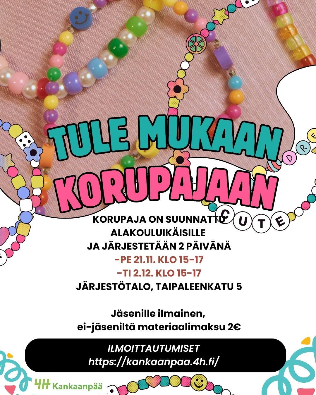 Pajassa tehdään helmikoruja, esim. ranne- ja kaulakoruja. Ensimmäisellä kerralla mm. askarrellaan fimo-massasta persoonallisia helmiä, joita voi hyödyntää seuraavalla kerralla korun tekemisessä. Materiaaleina on myös valmiita erilaisia helmiä mitä voi korutyössään hyödyntää.